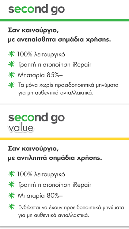 Παράλληλα, υπάρχουν διαφορετικές επιλογές κατάστασης και budget, ώστε να διαλέξεις αυτό που ταιριάζει καλύτερα στις ανάγκες σου. Έτσι, μπορείς να προσφέρεις ένα premium δώρο, χωρίς υπερβολές και χωρίς συμβιβασμούς στην ποιότητα. Μπορείς να διαλέξεις iPhone Second Go ή Second Go Value.